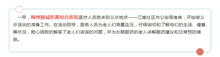為了更好地滿足社區(qū)居民的需求,傳播文明理念、引領(lǐng)文明風尚,提高居民的健康意識,倡導(dǎo)健康生活方式,普及健康生活理念,4月27日,梅州頤誠醫(yī)養(yǎng)結(jié)合醫(yī)院攜手江南社區(qū)居委,聯(lián)合鼎和社工、愛明眼科、澤山口腔、義剪志愿者服務(wù)隊開展“文明健康-有你有我”健康服務(wù)進小區(qū)活動